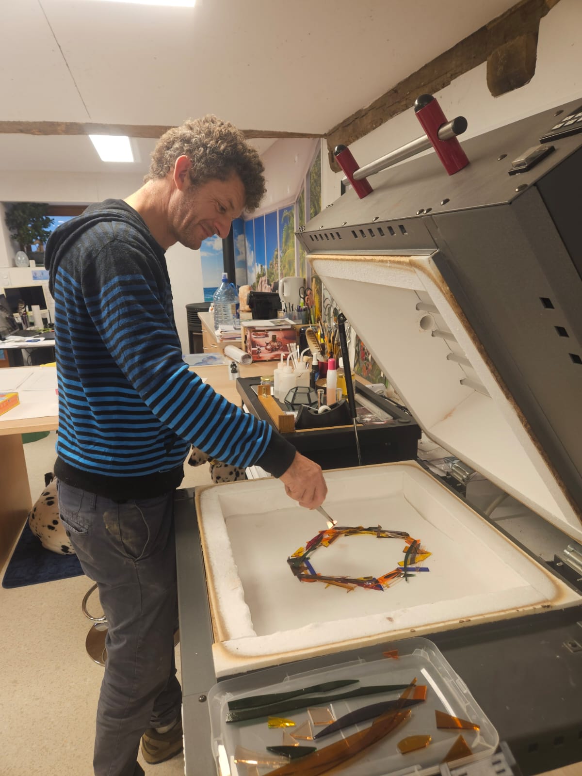 Depuis 2020, j’explore différentes techniques de travail du verre en parallèle du vitrail traditionnel, notamment le verre filé au chalumeau, le fusing et la technique Tiffany.